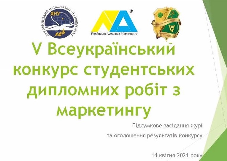 Вітаємо переможців V Всеукраїнського конкурсу дипломних робіт з маркетингу14 Квітня 2021р.![]() У січні - квітні 2021 року в Хмельницькому національному університеті на базі кафедри маркетингу і торговельного підприємництва проходив V Всеукраїнський конкурс дипломних робіт студентів закладів вищої освіти зі спеціальності 075 "Маркетинг" за рівнями вищої освіти бакалавр і магістр. У 2021 році в конкурсі взяли участь 32 заклади вищої освіти з 54 бакалаврськими та 102 магістерськими роботами. Для рецензування залучались як представники академічної спільноти, так і професіонали-практики (http://mr.khnu.km.ua/konkurs-dyplomnyh-robit-2021/). 14 квітня 2021 р. в онлайн-форматі відбулось підсумкове засідання журі та оголошення результатів конкурсу. Серед переможців - дві роботи, які виконувались на базі кафедри маркетингу імені А.Ф. Павленка КНЕУ ім. В. Гетьмана:
