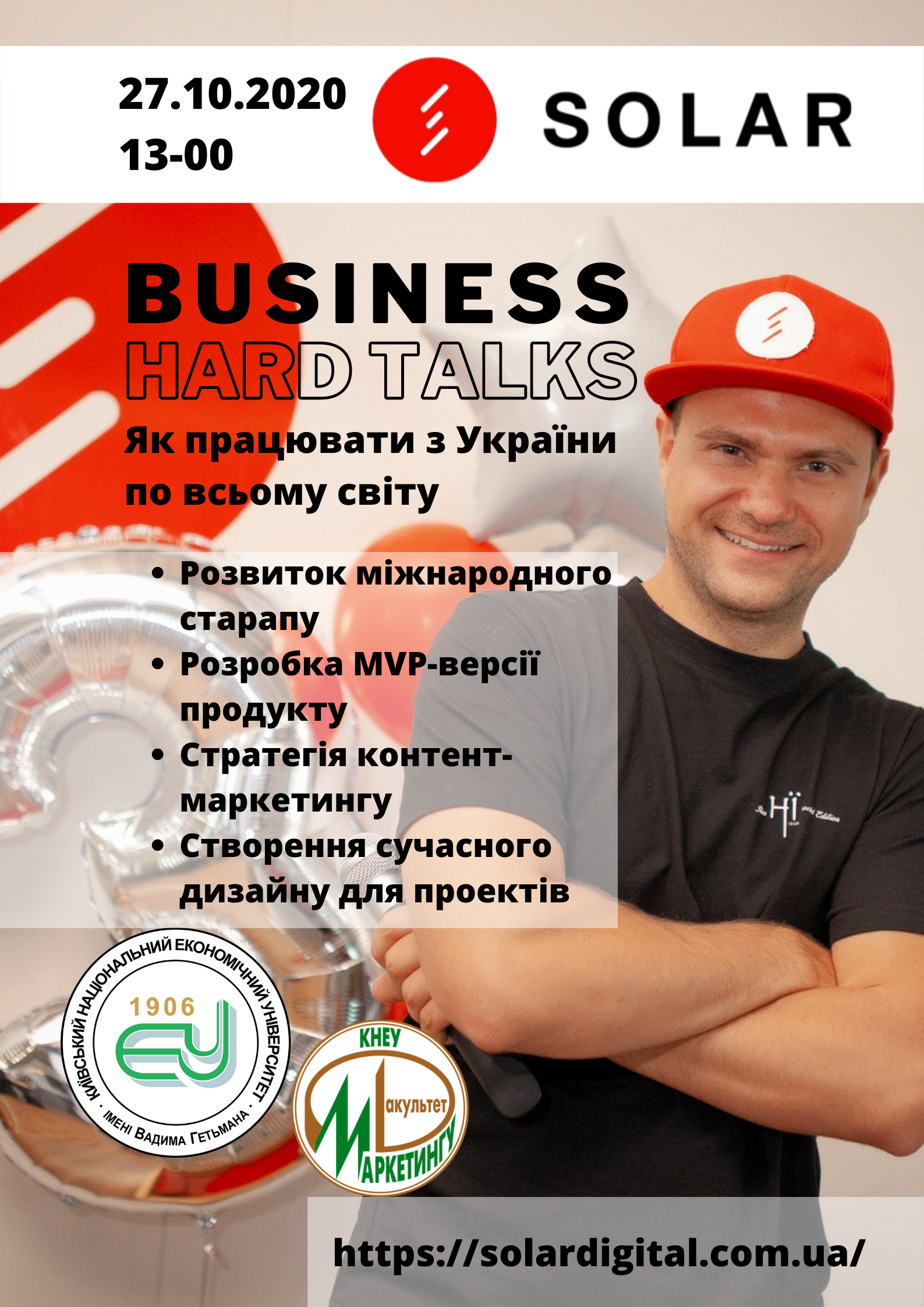 BUSINESS HARD TALKS27 Жовтня 2020р.![]() BUSINESS HARD TALKS Дата: 27/10/2020 Час: з 13-00 до 14-10 (четверта пара, онлайн) Мова: російська, українська Участь безкоштовна для студентів ДВНЗ «Київський національний економічний університет імені Вадима Гетьмана» Про що мова? Поговоримо про те, як з України працювати зі всім світом. Розглянемо такі аспекти: розвиток міжнародного старапу, розробка MVP-версії продукту, стратегія контент-маркетингу, а також створення сучасного дизайну для ІТ-проектів.