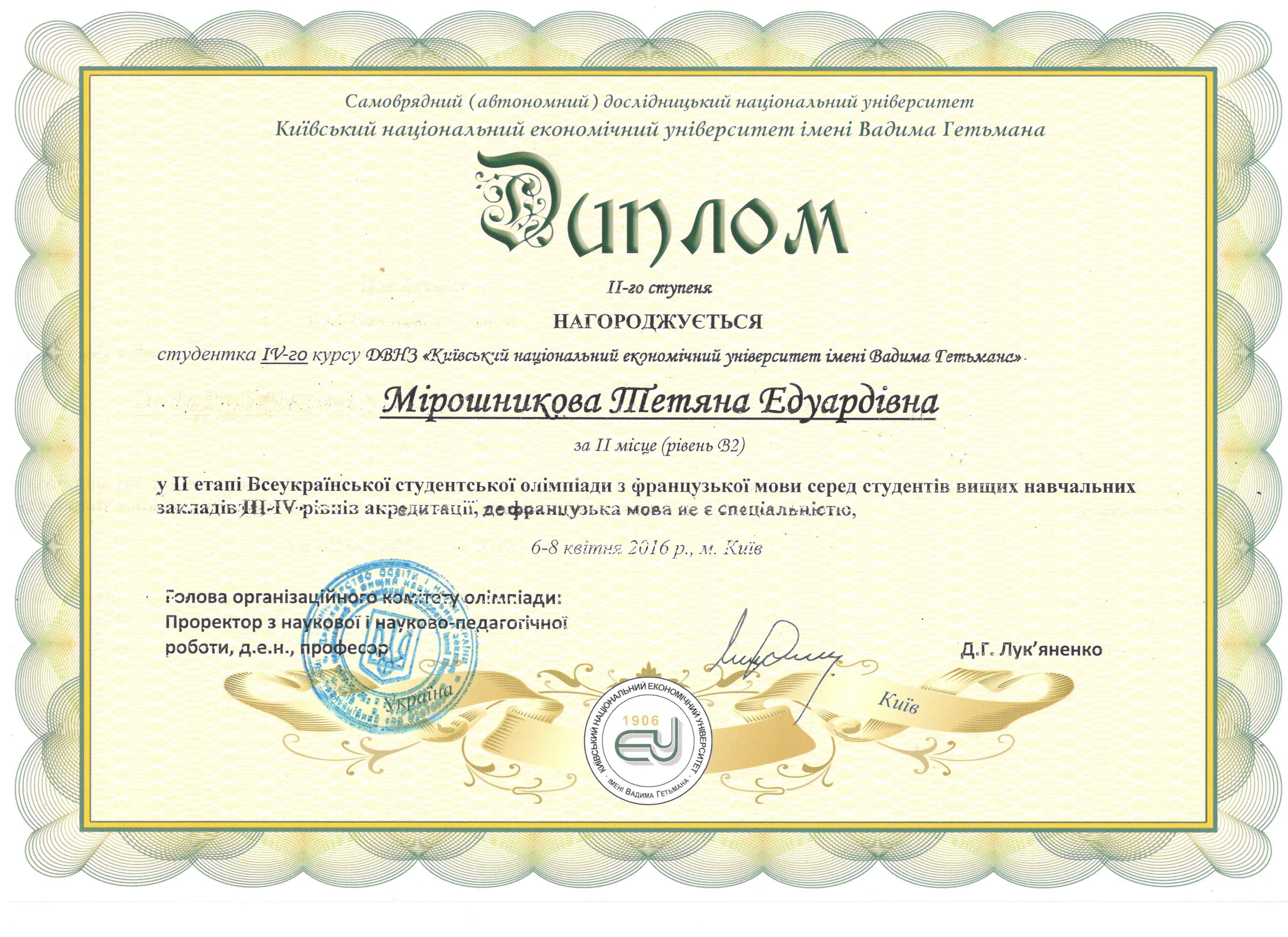 Конкурсна комісія нагородила студентку ІV курсу Мірошникову Тетяну Едуардівну Дипломом за ІІ місце (рівень В2).